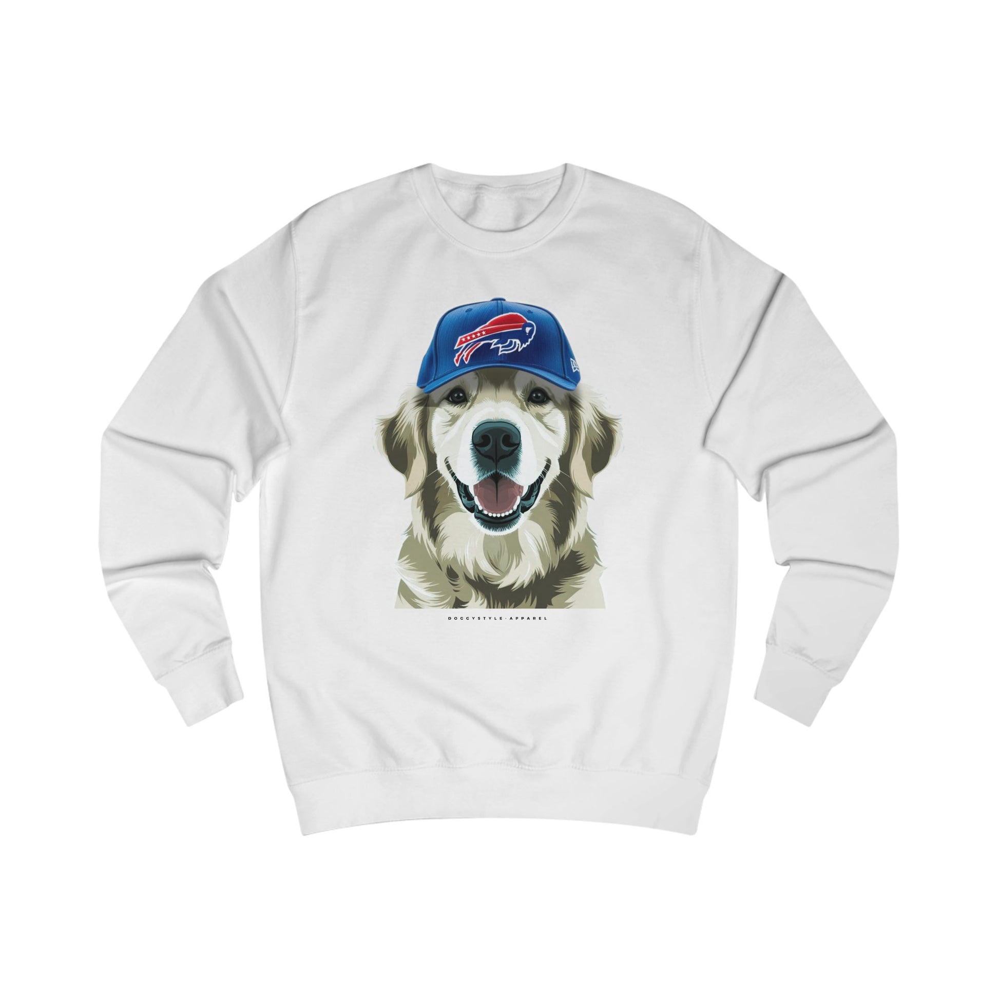 A cozy unisex sweatshirt featuring a design of a bills-loving golden, perfect for football fans on game day. This sweatshirt exudes a casual and fun vibe, ideal for snuggling up in during chilly game nights. Perfect for adults who enjoy football festivities and want to show off their team spirit. Great for wearing during football season, game days, and sports-themed gatherings.