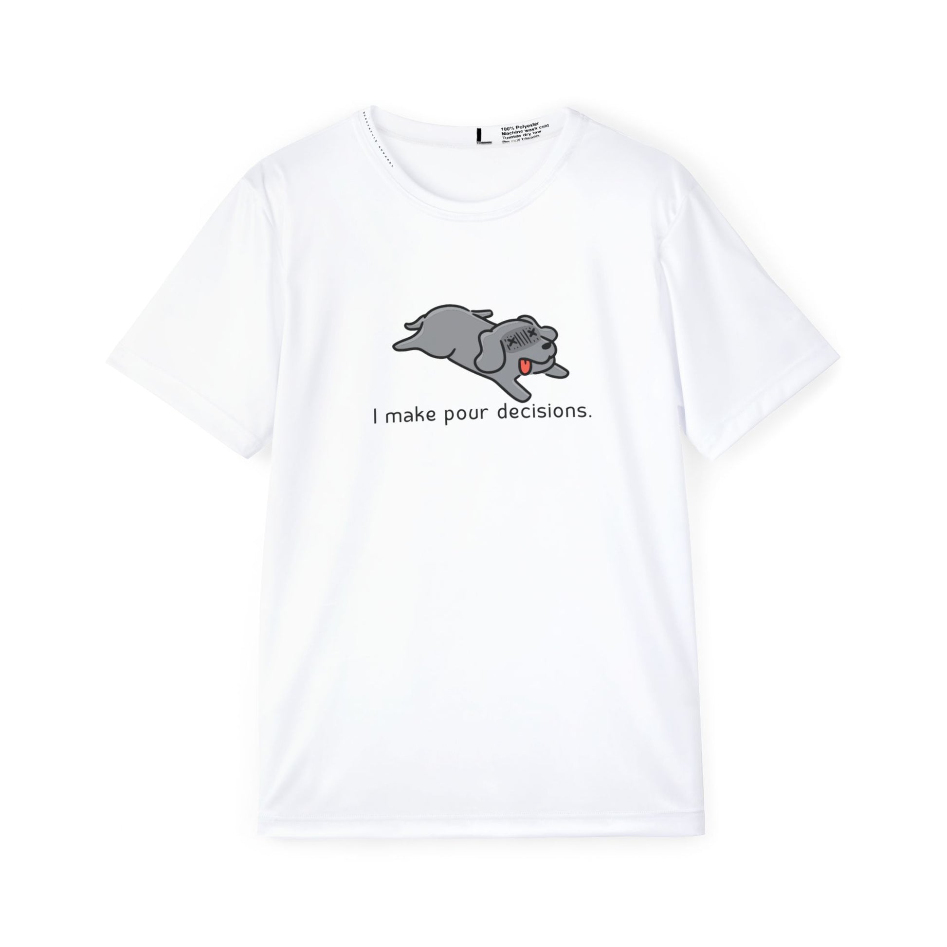 The 'I make pour decisions' Athletic Tee is perfect for the sports enthusiast who loves humor. Made from 100% Polyester, this tee is durable and dries quickly, making it ideal for any physical activity. With vibrant colors and moisture-wicking material, this tee keeps you cool and comfortable. The classic fit and ribbed collar make it a must-have for casual wear or working out.