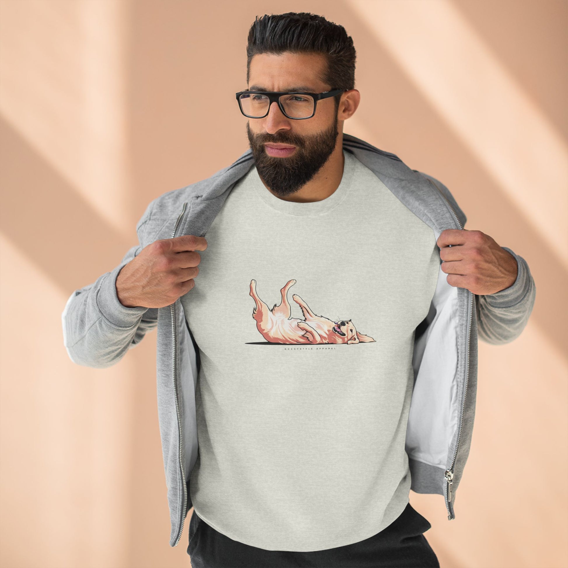 A playful dog relaxing on a Crewneck Sweatshirt that exudes a cozy and laid-back vibe, perfect for dog lovers and casual wear enthusiasts. This sweatshirt is ideal for lounging at home, running errands, or hanging out with friends. Suitable for dog-themed parties, casual Fridays, and weekend outings.