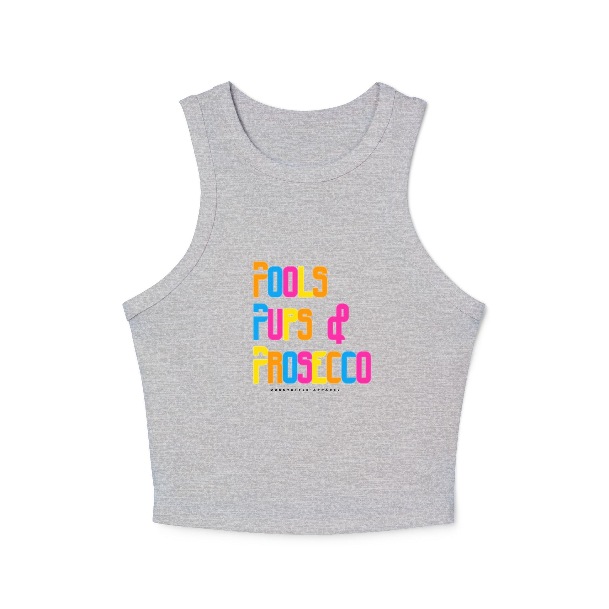 The 'Pools, Pups & Prosecco' Tank Top exudes a fun and carefree vibe, perfect for summer days by the pool or casual outings with friends. The high neck style and fitted design offer a modern and chic look, ideal for layering or wearing on its own. Relevant for women who enjoy relaxing by the pool, spending time with their furry friends, and sipping on prosecco during warm weather.